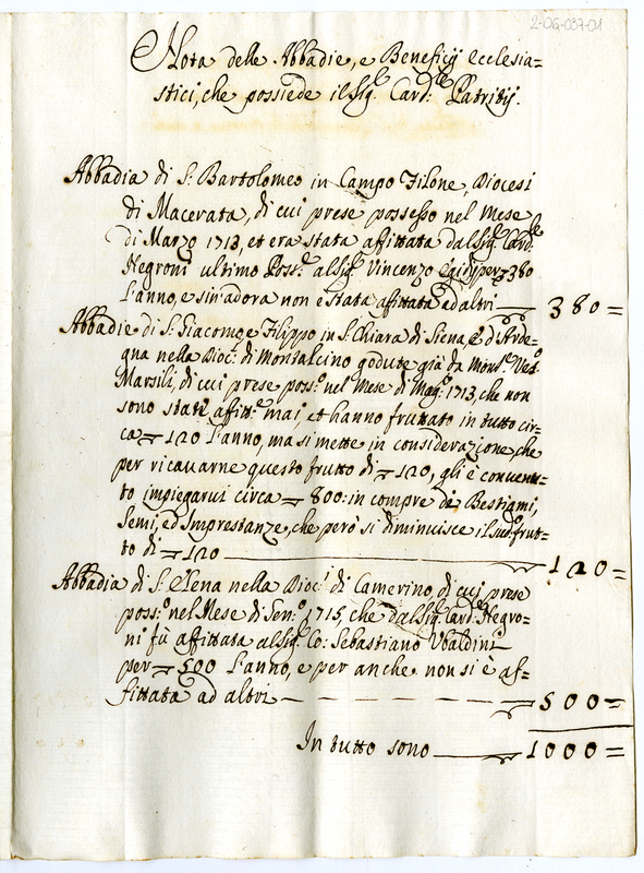 Nota delle Abbadie e beneficii ecclesiastici che possiede il Signr Cardinale Patrizi (1700-1721)