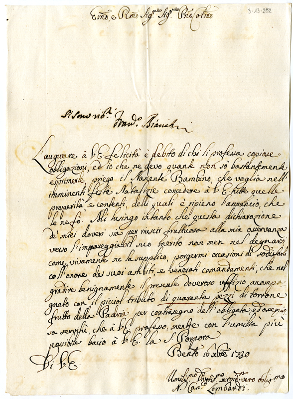 Lettera di Lombardi al cardinale Annibale Albani (1730 dicembre 16)