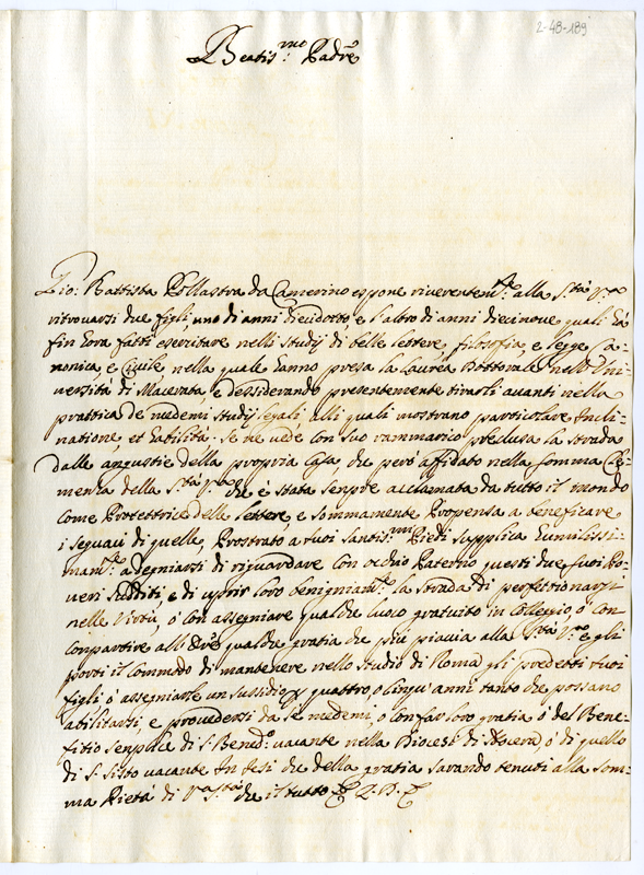 Avendo due figli lauretati nell'Università di Macerata, chiede al pontefice un qualche aiuto in modo che possano continuare gli studi