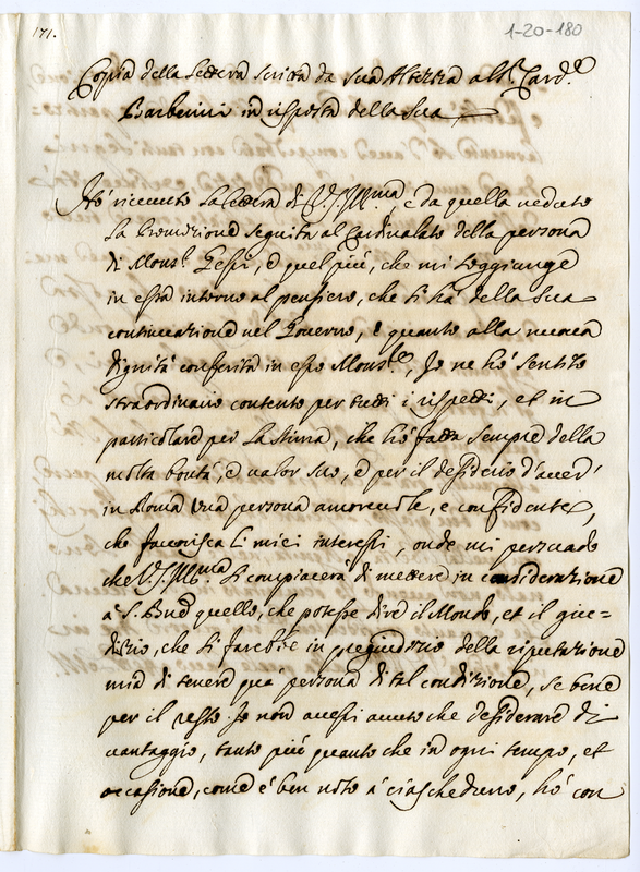 Mostra soddisfazione per la avvenuta nomina a cardinale di monsignor Gessi, ma prega tuttavia il cardinale Barberini di far presente al pontefice la limitazione alla libertà e all'onore che ne verrebbe al duca col rimanere di tal personaggio ad Urbino