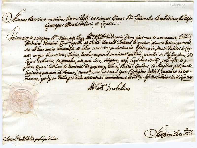 Attestato rilasciato dal cardinale Barbarigo in favore di Baldo Antonio Giannini di Città di Castello (1702 settembre 6)