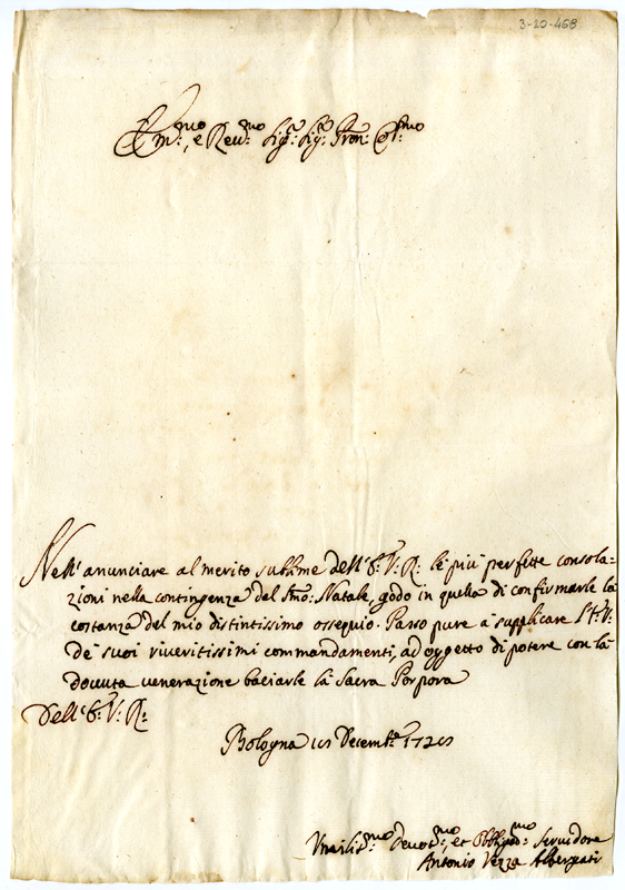 Lettera di Antonio Vezza Albergati al cardinale Annibale Albani (1728 dicembre 18)