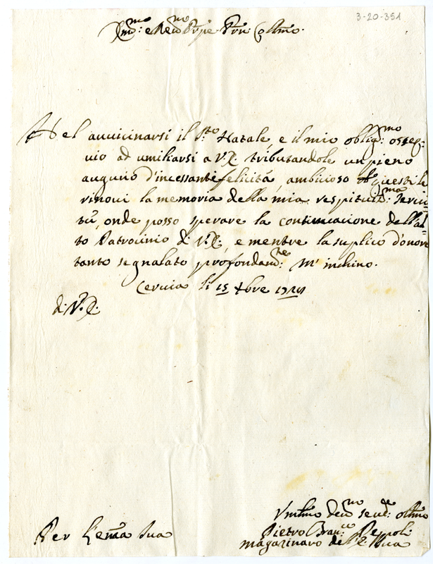 Lettera di Pietro Francesco Peppoli al cardinale Annibale Albani (1728 dicembre 15)
