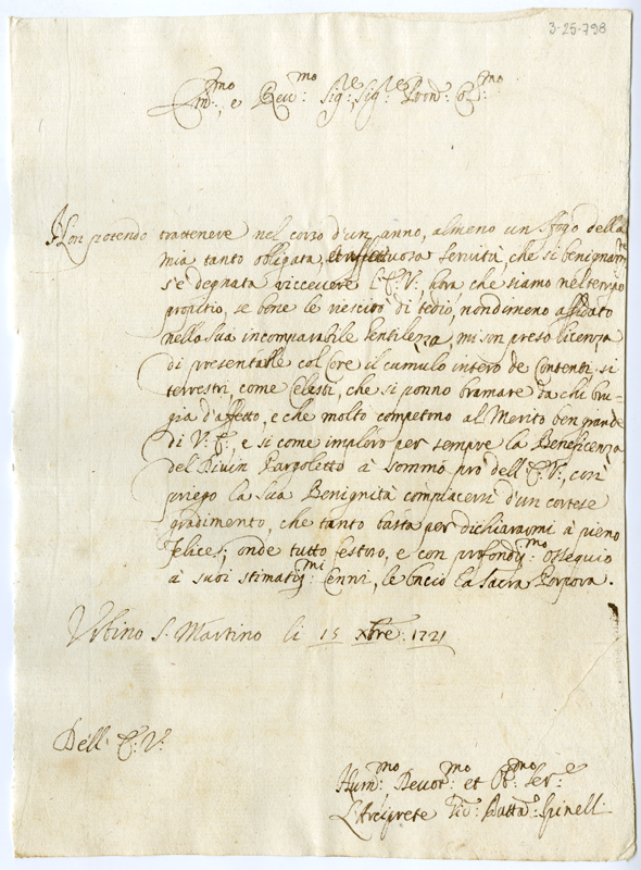 Lettera di Giovanni Battista Spinelli al cardinale Annibale Albani (1721 dicembre 15)