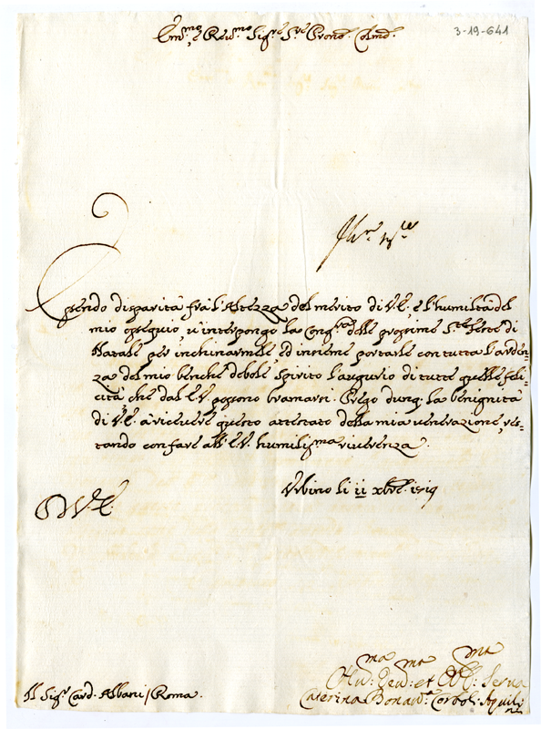 Lettera di Caterina Bonaventura Corboli Aquilini al caridinale Annibale Albani (1719 dicembre 11)