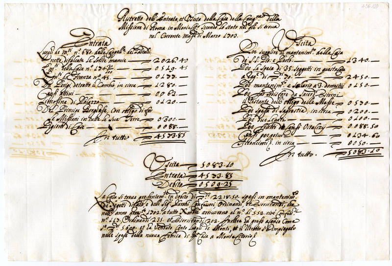 Ristretto dell'entrata, et uscita della Casa della Congregazione della Missione di Roma in Monte Citorio secondo lo stato nel quale si trova nel corrente mese di marzo 1703