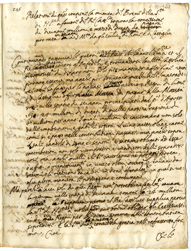 Relazione di quanto contiene la minuta del Breve della Santità di Nostro Signore a favore del Re Cattolico sopra la concessione di dicianove millioni e mezo di ducati da pagarsi pro rata in sei anni a Sua Maestà dagli ecclesiastici de Regni di Lione e di Castiglia