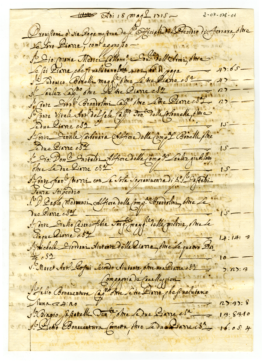 Adi 18 maggio 1715. Provisioni o sia Paga mestrua degli Officiali del Presidio di Ferrara, oltre le loro Piazze, com'appresso