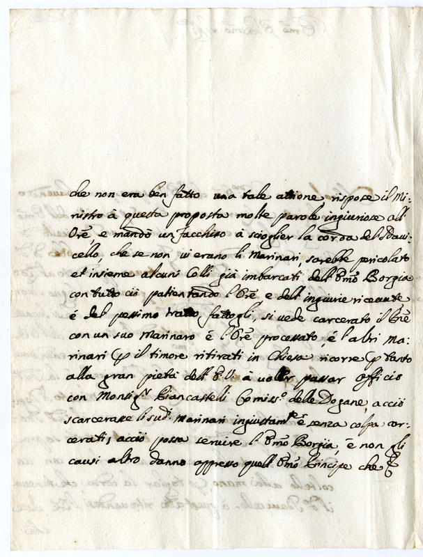 Supplica il cardinale di interessare monsignore Pincastelli commissario delle dogane per scarcerare alcuni marinai incarcerati ingiustamente senza colpa al servizio del cardinale Borgia