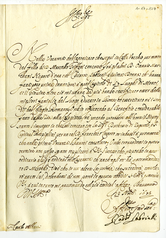 Lettera del cardinale Giulio Gabrielli a Carlo Albani (1673 novembre 23)