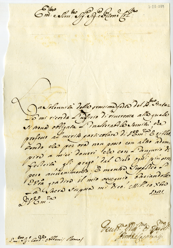 Lettera di Pino de Capitanei al cardinale Annibale Albani (1721 dicembre 10)