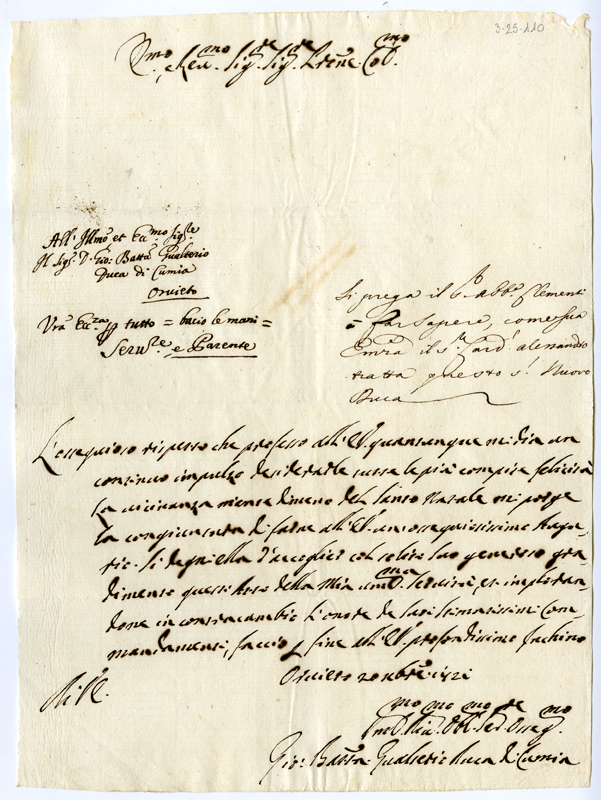 Lettera di Giovanni Battista Gualterio al cardinale Annibale Albani (1721 dicembre 20)