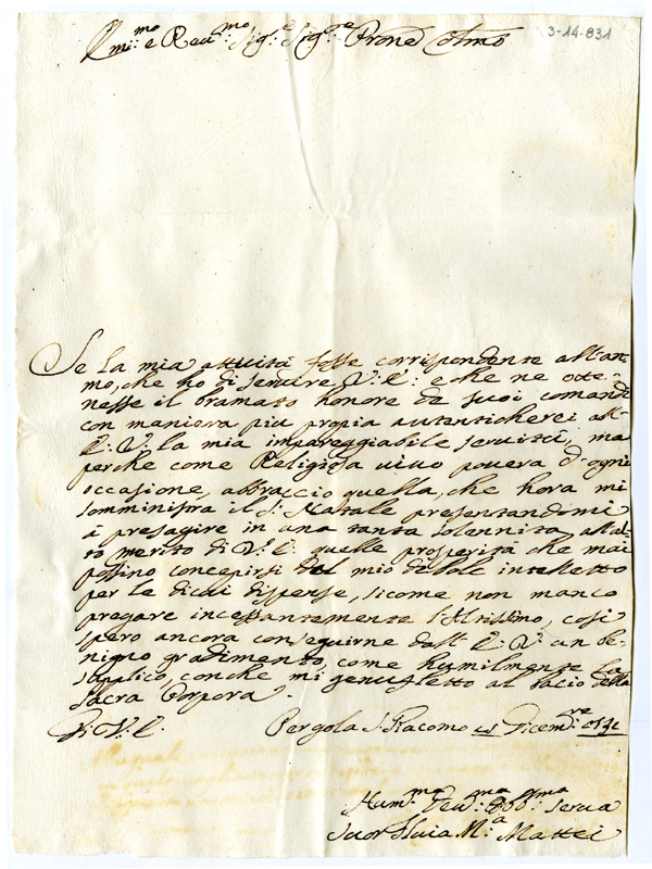 Lettera di suor Silvia Maria Mattei al cardinale Annibale Albani (1731 dicembre 18)