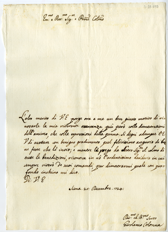 Lettera di Girolamo Colonna al cardinale Annibale Albani (1724 dicembre 20)