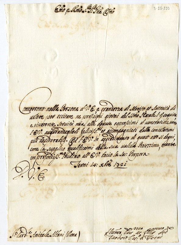 Lettera di Teodoro vescovo di Terni al cardinale Annibale Albani (1721 dicembre 14)