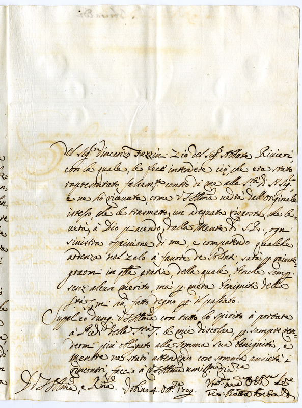Lettera di Giovanni Battista Antaldi a Illustrissimo e Reverendissimo Signore (1709 ottobre 4)