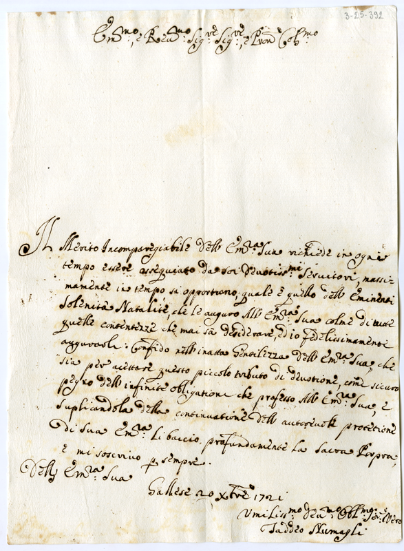 Lettera di Taddeo Numagli al cardinale Annibale Albani (1721 dicembre 20)
