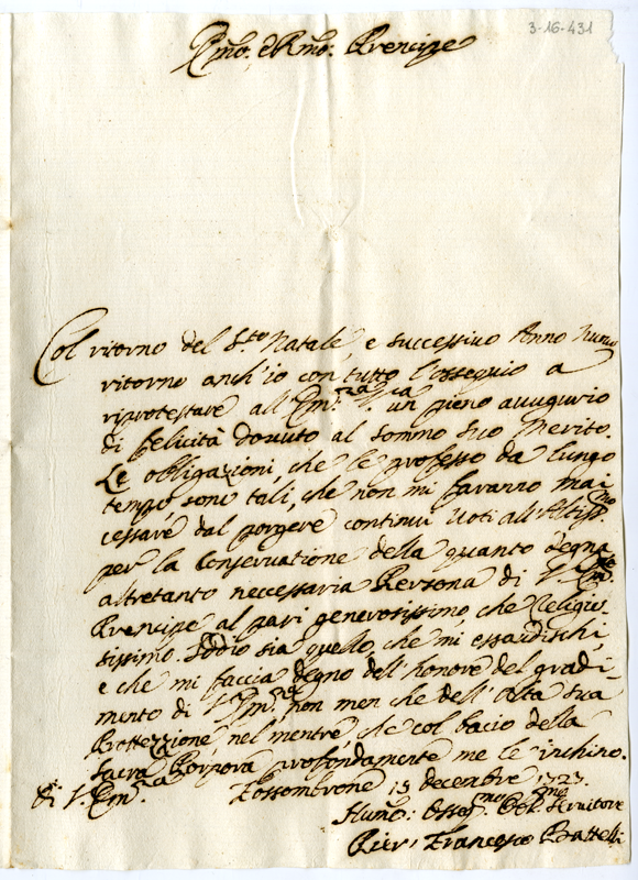 Lettera di Pier Francesco Battelli al cardinale Annibale Albani (1727 dicembre 15)