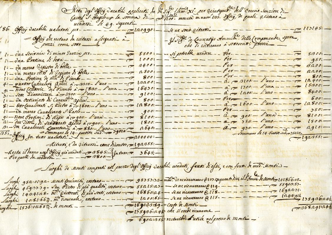 Nota degl'Officii vacabili applicati da Nostro Signor Clemente XI per la reintegrazione dell'erraraio sanziore di Castel Sant'Angelo (1700-1721)