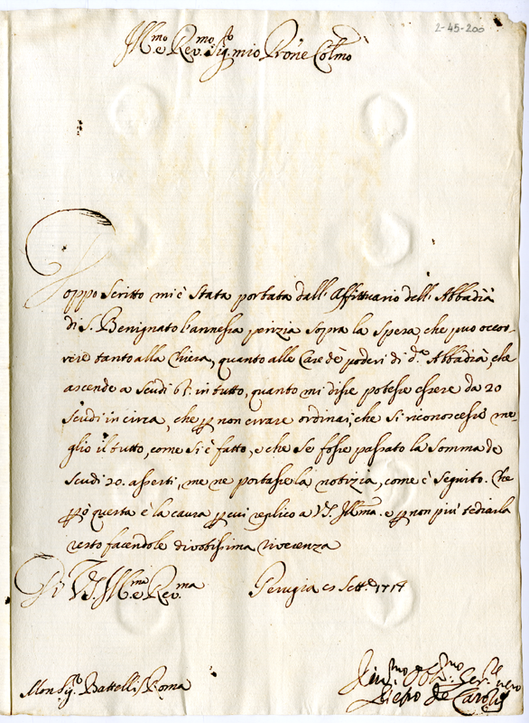 Lettera di Pietro de Carolis a monsignor Battelli (1714 settembre 8)