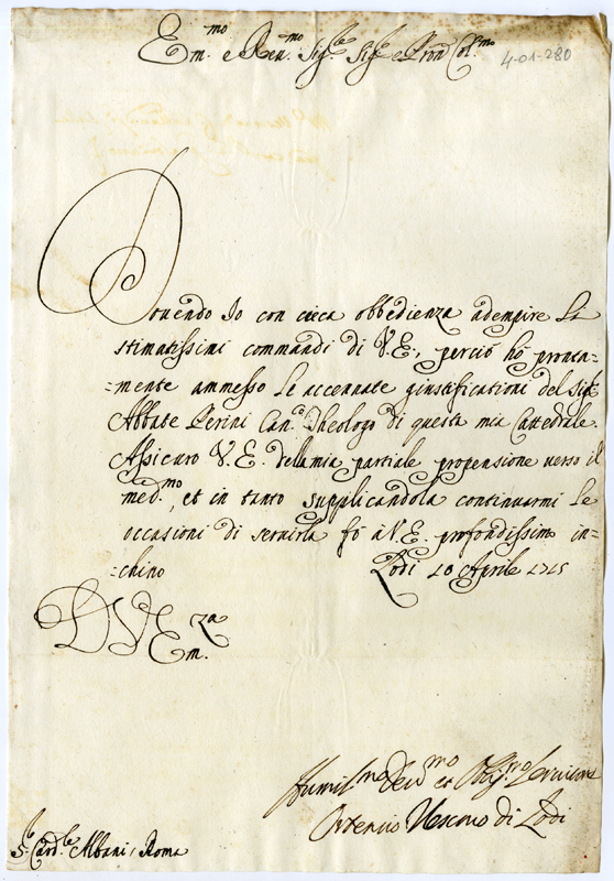 Lettera di Ortensio Vescovo di Lodi al Cardinale Annibale Albani (1715 aprile 10)