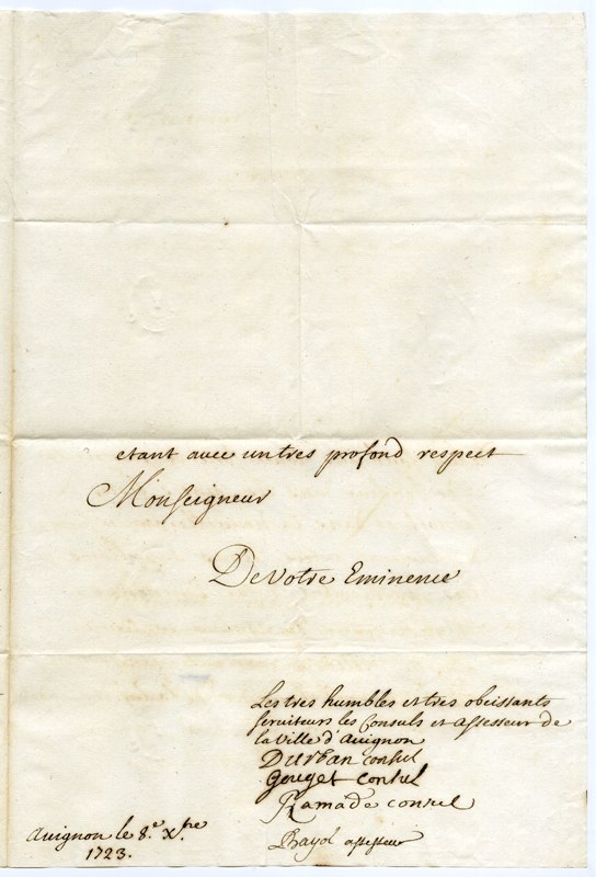 Lettera dei consoli e assessore di Avignone al cardinale Annibale Albani (1723 dicembre 8)