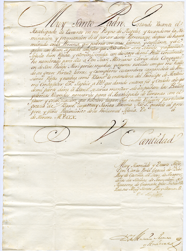 Lettera di Carlo III re di Spagna a Clemente XI (1710 gennaio)