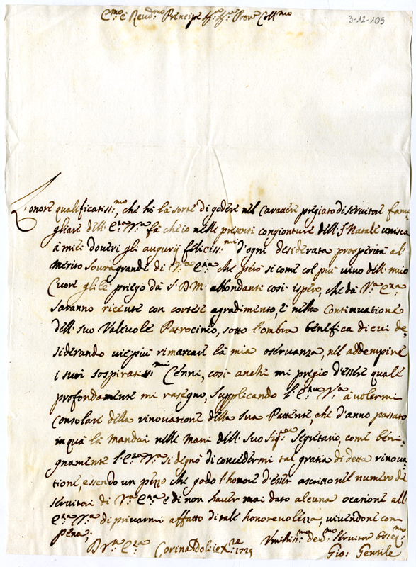Lettera di Giovanni Gentile al cardinale Annibale Albani (1725 dicembre 10)