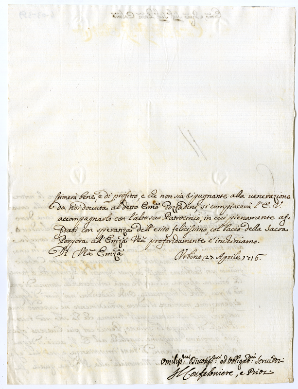 Lettera del Gonfaloniere e Priori di Urbino al Cardinale Annibale Albani (1716 aprile 27)