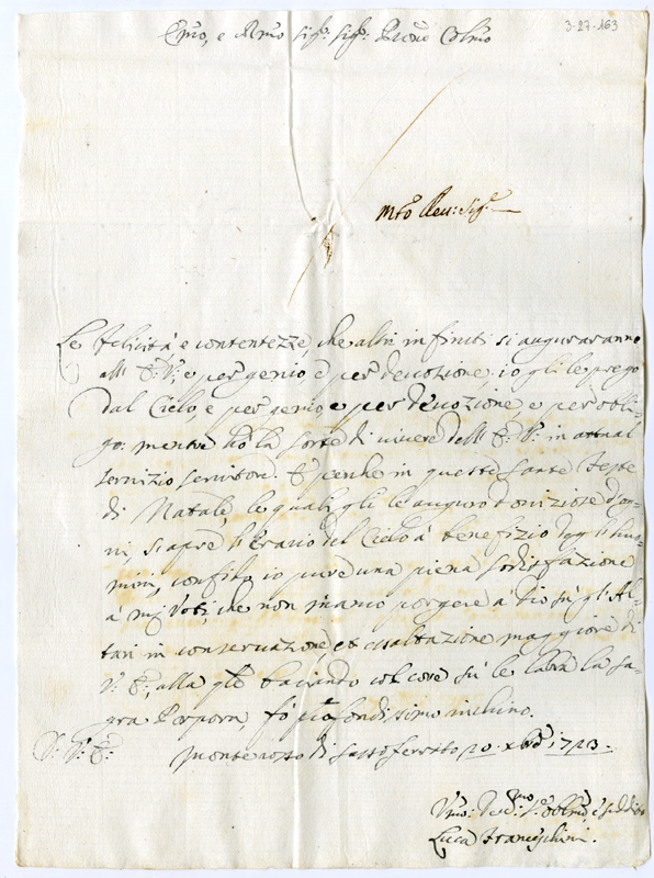 Lettera di Luca Franceschini al cardinale Annibale Albani (1723 dicembre 20)