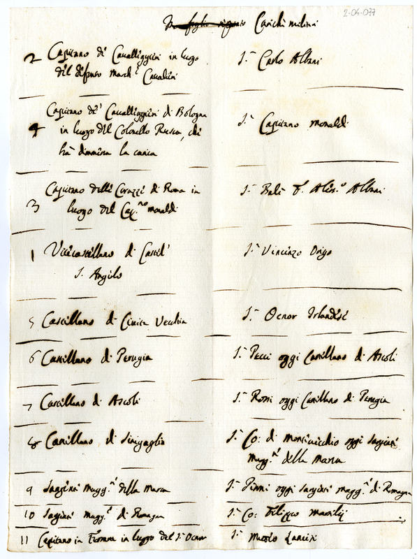 Nota di incarichi militari conferiti da Papa Clemente XI (1709)