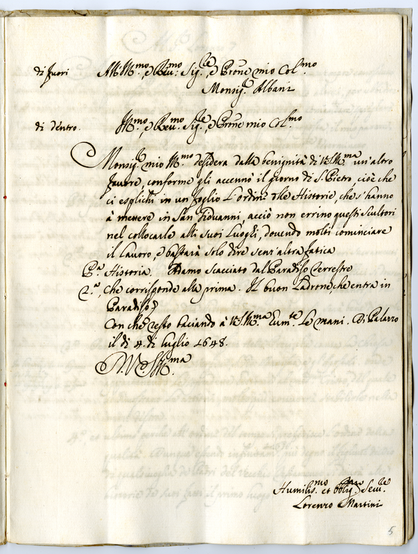 Descrizione fatta da Annibale Albani delle "Istorie rappresentate in bassi rilievi e collocate nella basilica di S. Giovanni in Laterano sopra le nicchie delle statue". Precede lettera di Lorenza Martini ad Annibale Albani (1648 luglio 4)