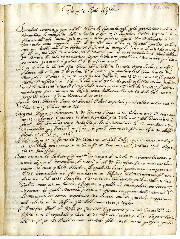Spiegazione dei motivi per una risposta negativa alla istanza dell'abate di Lussemburgo per la provisione della commenda di Montpellier dell'ordine di Santo Spirito
