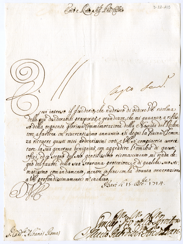 Lettera di Muzio arcivescovo di Bari al cardinale Annibale Albani (1714 dicembre 15)