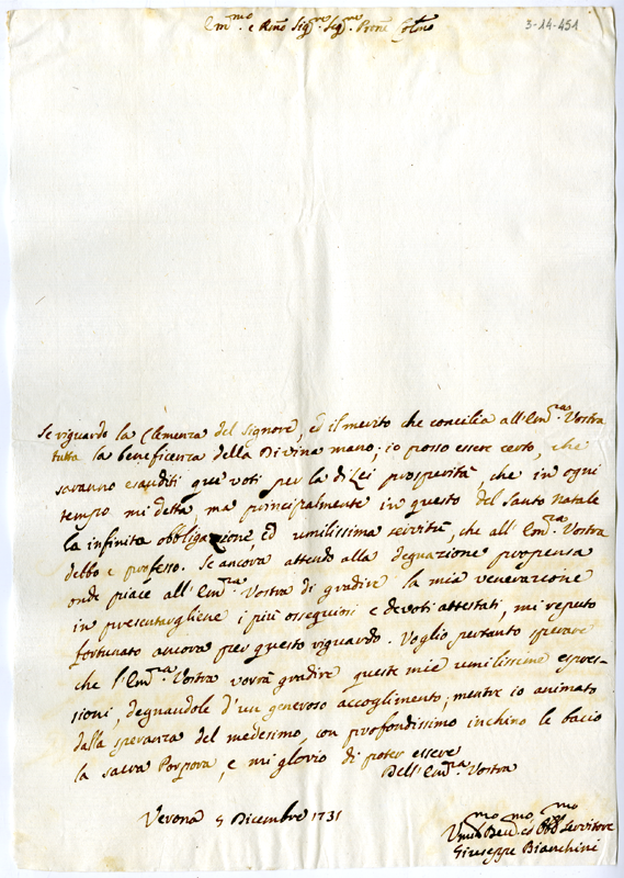 Lettera di Giuseppe Bianchini al cardinale Annibale Albani (1731 dicembre 5)