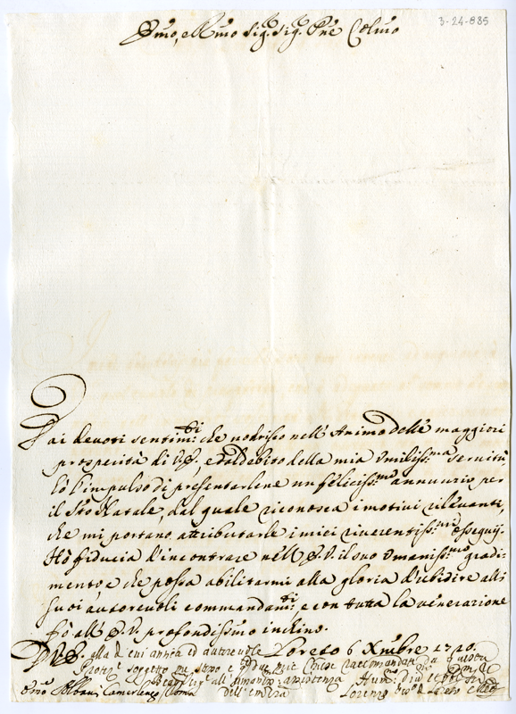 Lettera di Lorenzo vescovo di Loreto e Recanati al cardinale Annibale Albani (1720 dicembre 6)
