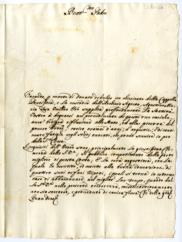 Chiede un chiericato della cappella pontificia e la custodia dell'archivio segreto