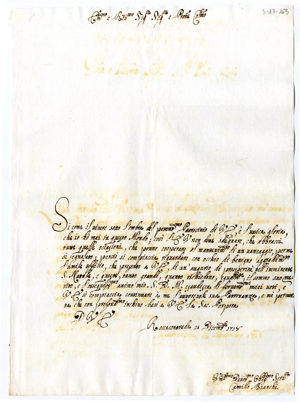Lettera di Camillo Bianchi al cardinale Annibale Albani (1718 dicembre 15)