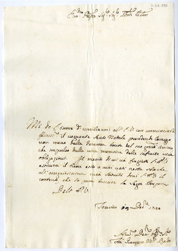 Lettera di fra Giuseppe Maria Rado al cardinale Annibale Albani (1720 dicembre 13)