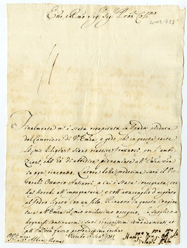 Lettera di Valerio Rota al Cardinale Annibale Albani (1715 settembre 16)