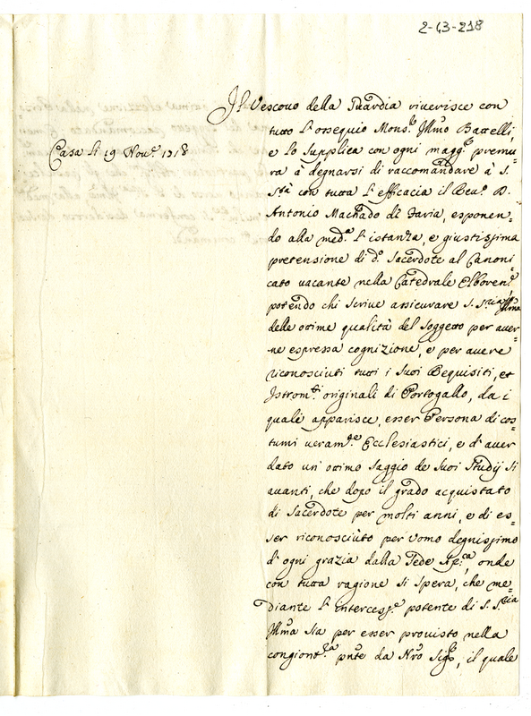 | dc.description | Supplica monsignor Battelli di degnarsi di raccomandare al pontefice don Antonio Machado di Faria per un canonicato vacante nella cattedrale elborense di Portogallo | |