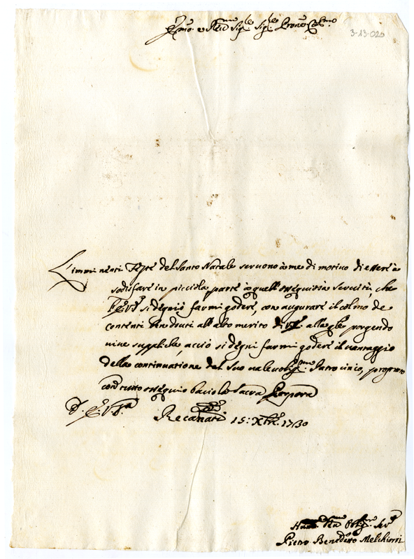 Lettera di Pietro Benedetto Melchiorri al cardinale Annibale Albani (1730 dicembre 15)