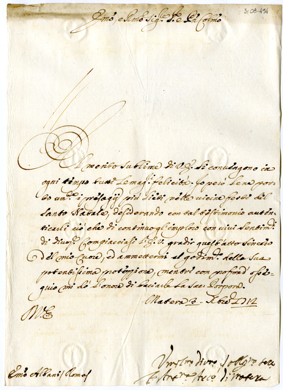 Lettera di Antonio arcivescovo di Molfetta al cardinale Annibale Albani (1712 dicembre 3)