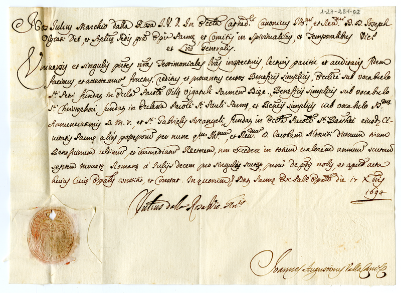 4. Attestato della rendita di tre benefici della chiesa di Parma goduti da Giacomo Altoviti (1694 dicembre 17)