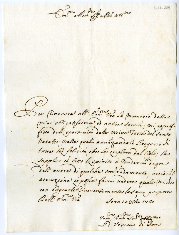 Lettera di Gabriele vescovo di Sora al cardinale Annibale Albani (1720 dicembre 17)