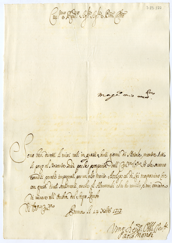 Lettera di Paolo Monti al cardinale Annibale Albani (1717 dicembre 14)