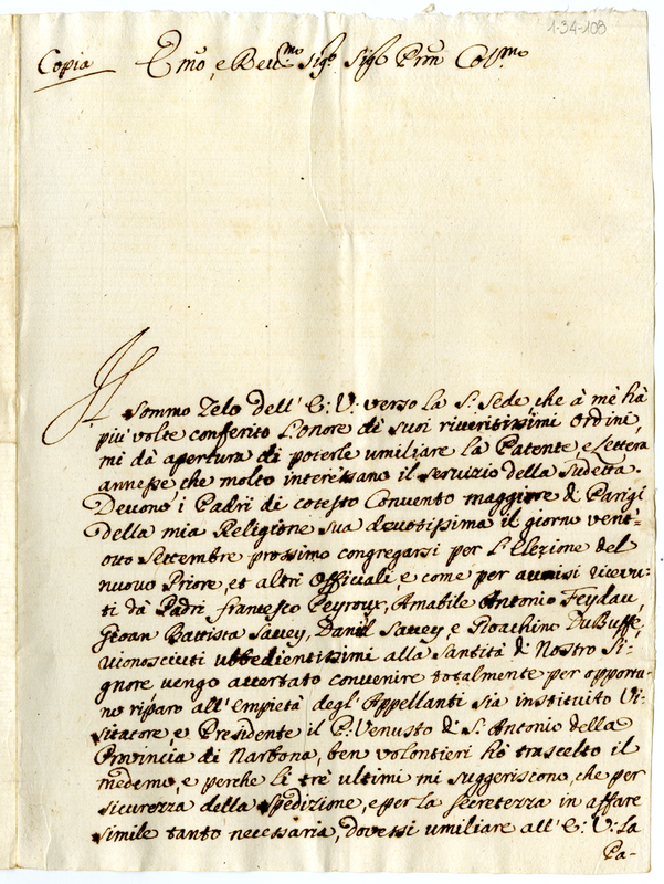 Copia. Lettera di Carlo Cornaccioli generale dei carmelitani a un cardinale (1720 luglio 31)