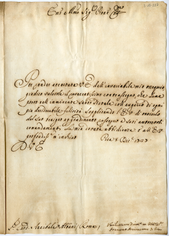 Lettera di Francesco arcivescovo di Pisa al cardinale Annibale Albani (1727 dicembre 8)