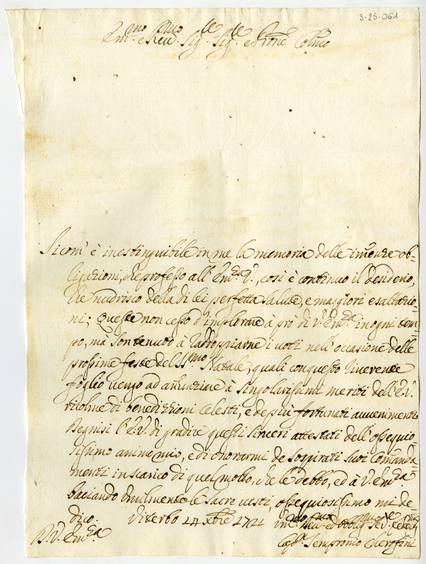 Lettera di Sempronio Cherofini al cardinale Annibale Albani (1721 dicembre 14)