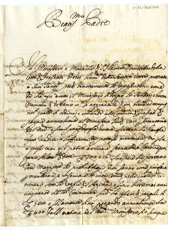 Le monache di Santa Flavia Domitilla di Frascati supplicano il pontefice di ottenere un nuovo finanziamento per il mantenimento del convento